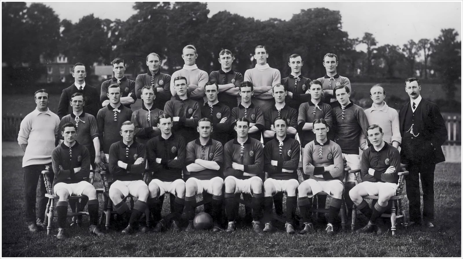 Middle row: T. Haynes (Trainer), W. Sutherland, A. Peard, W. Litt, J. McCormick, G. Malcolm, A. Tainsh, M. Thom, J. Paltridge, F. Worden, A. Wheaton (assistant trainer), R. Jack (manager)