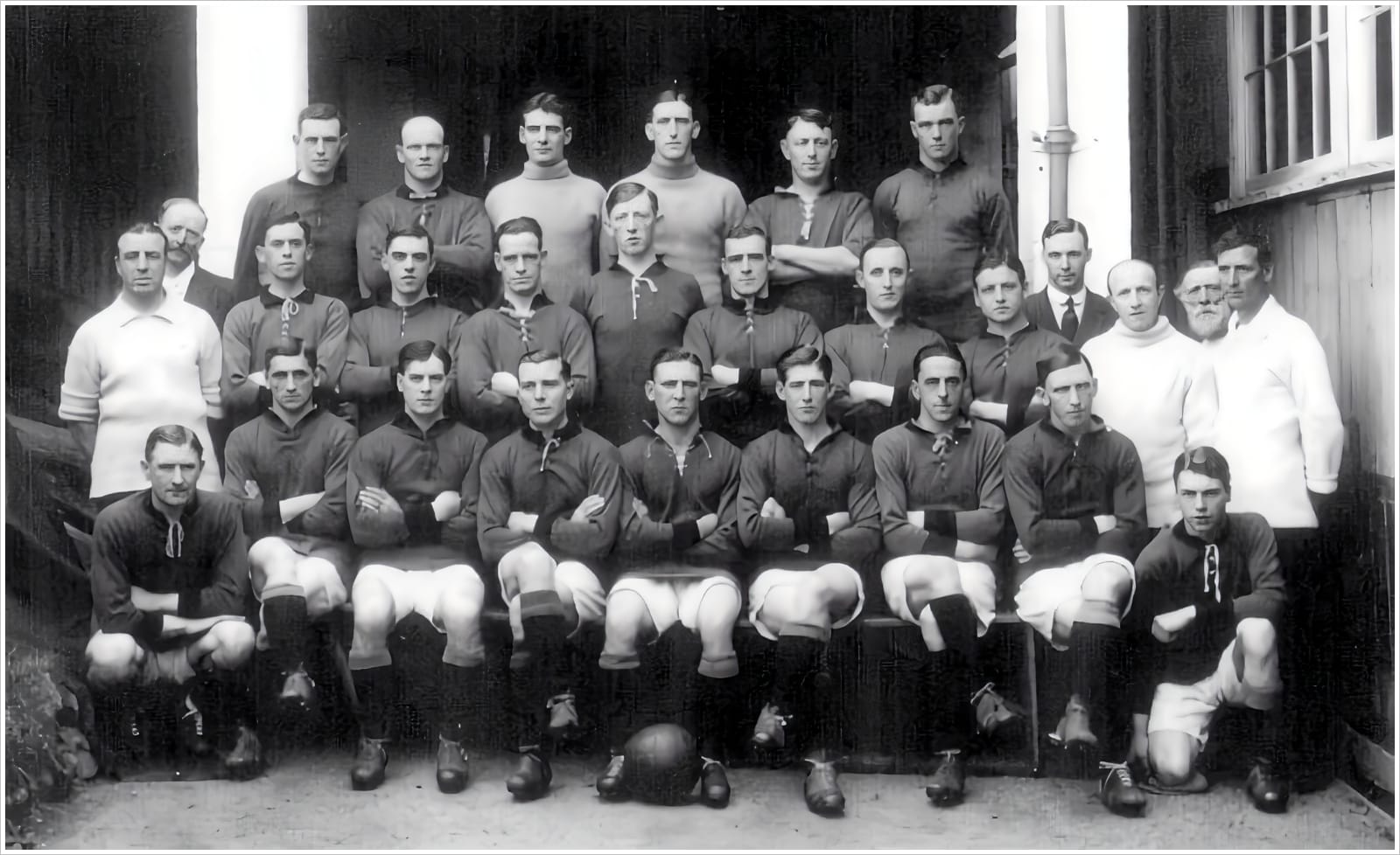 Middle row: T. Haynes (Trainer), J. Horton (Groundsman), R.W. Perrett, F. Cosgrove, W. Kellock, J.H. Hill, J. Logan, W. Forbes, G.H. Cook, D.B.N. Jack, A.J. Wheaton (Reserves’ Trainer), W.J. Hayes (Assistant Groundsman), J. Banks (Assistant Trainer)