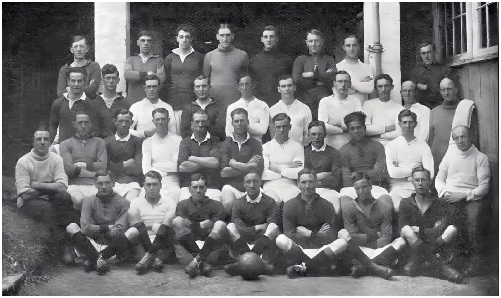 Third row: J. Fowler, L.C. Deacon, W.G. Frost, B. Bowler, H.R.V. Counter, W. Pillinger, W. Prouse, E. Jones, M. Russell, A.H. Rhodes (Assistant Trainer)