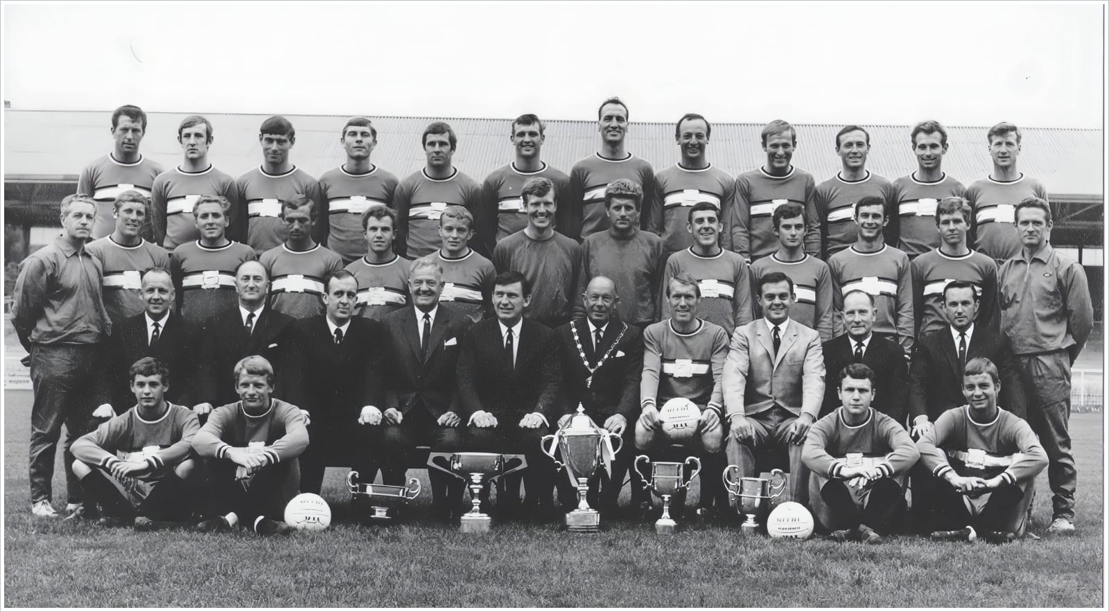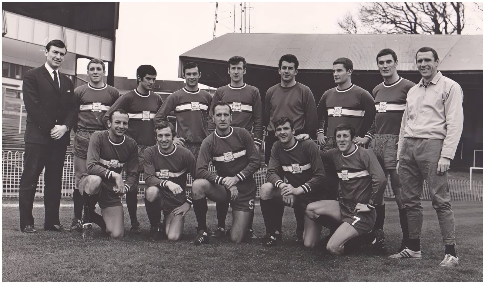 Front row: Fred Easton (Public Relations Officer), Charles Joce (Director), Brian Williams (Director), Harry Deans (Director), Derek Ufton (Manager), Clifford Crookes (Chairman), Johnny Newman (Captain), Robert Daniel (Vice-Chairman), Stafford Williams (Director), Graham Little (Secretary)