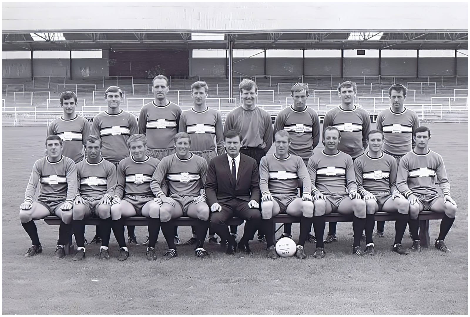 Back row: Derek Ufton (Manager), John Hore, Norman Piper, John Mitten, Doug Baird, Pat Dunne, Mike Harrison, Alan Peacock, Frank Lord (Player-Coach)