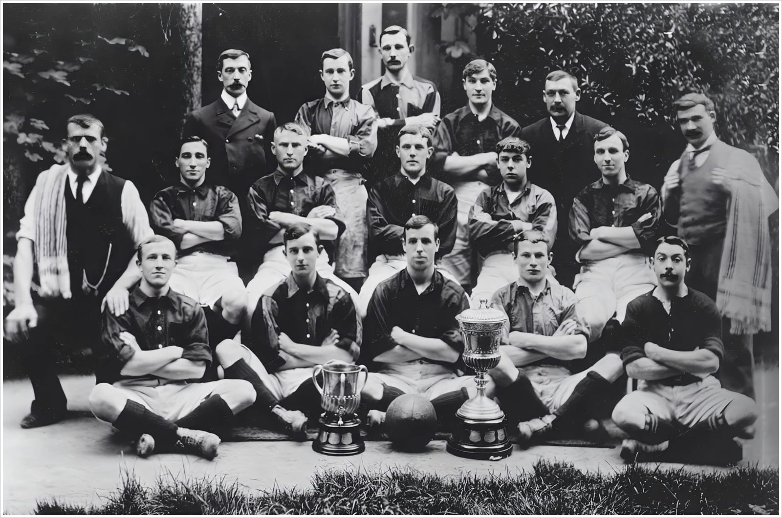 This photograph, taken at the end of the 1902-03 season, is the last known image of the Argyle Football Club, winners in their final season of the Devon Senior League Cup (left) and the Devon Senior Cup (right).