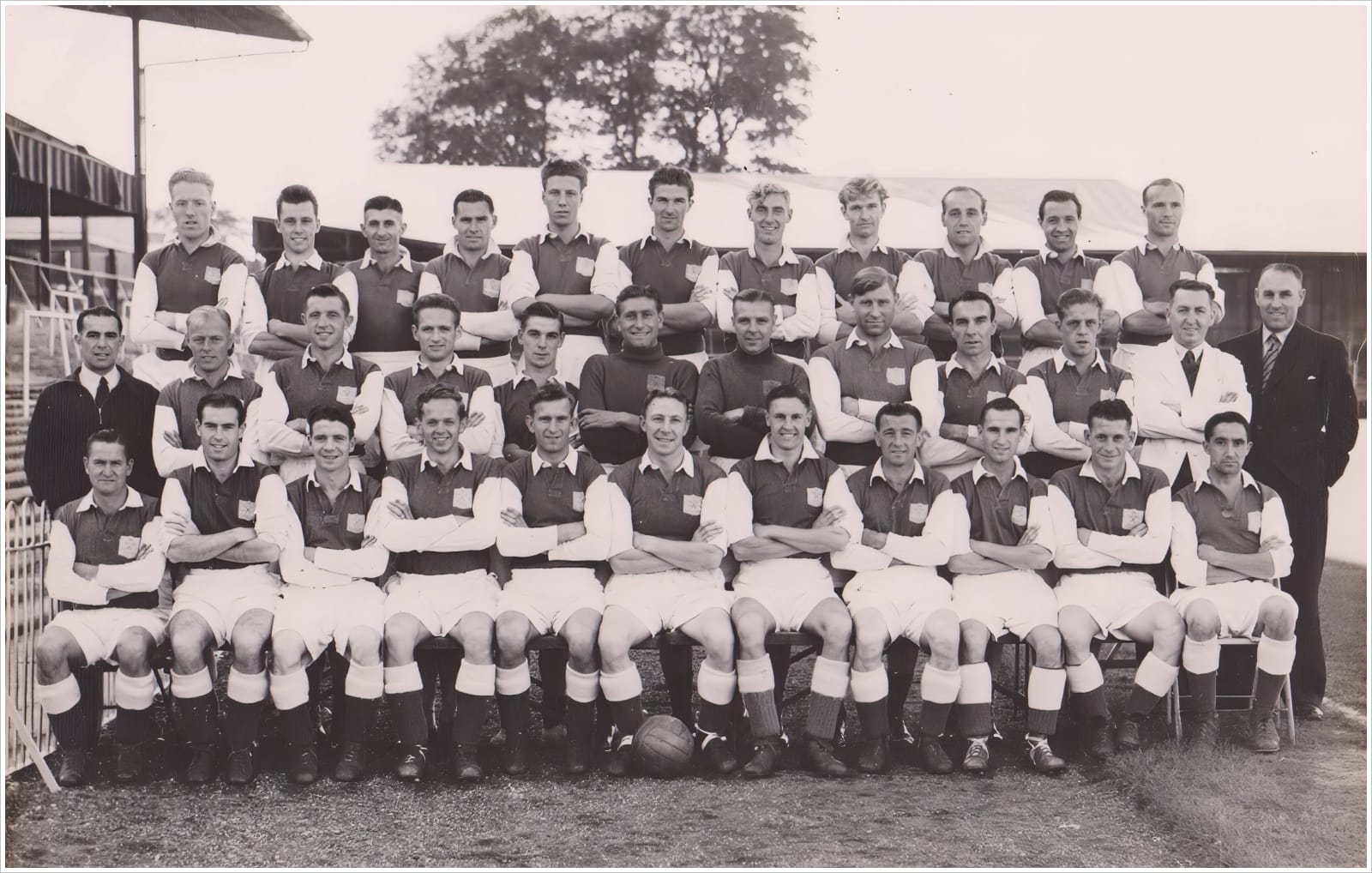 Middle row: George Taylor (Trainer), George Dews, Ted Jelly, Neil Dougall, Ron Shorthouse, Les Major, Bill Shortt, Jack Chisholm, Johnny Porteous, Len Kneebone, George Reed (Trainer), Jimmy Rae (Manager)