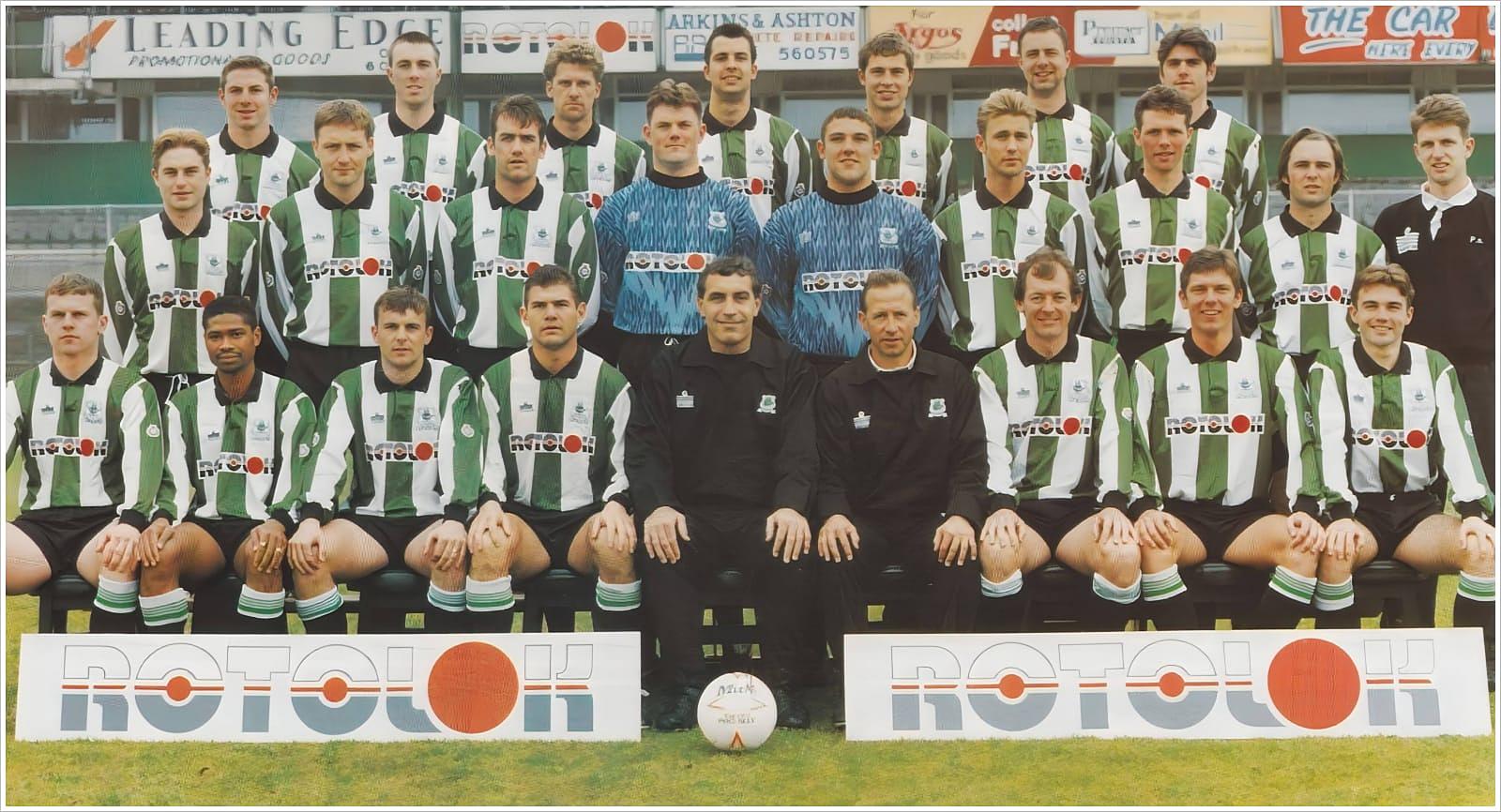 Front row: Dominic Naylor, Dwight Marshall, Mark Patterson, Steve Castle, Peter Shilton (Player/Manager), John McGovern (Assistant Manager), Steve McCall, Paul Dalton, Martin Barlow
